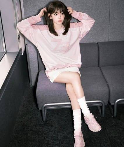르세라핌의 사쿠라는 연한 핑크 스웨트셔츠와 미니스커트 조합으로 귀엽고 발랄한 분위기를 연출했다.