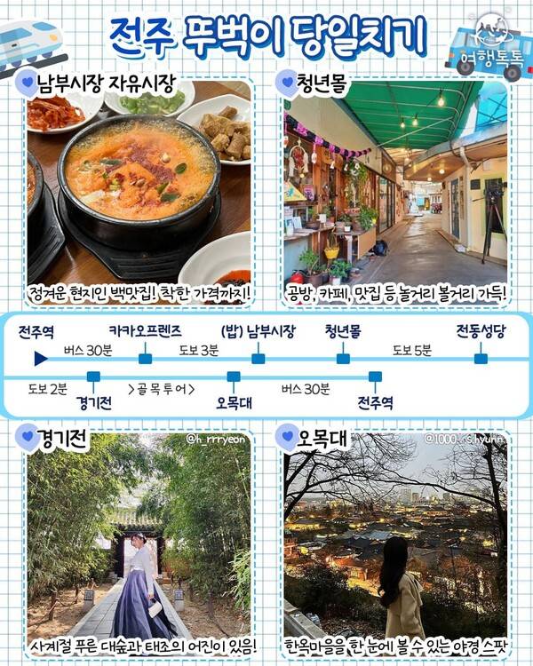 오늘 여행톡톡에서는 전주 뚜벅이 당일치기 여행코스를 소개해 드리려 하는데요. 차없어도 멀리 다녀올 수 있다는 것을 우리 모두 함께 보여주며, 한복도 입어보고 특별한 추억을 쌓아보시길 바랍니다.