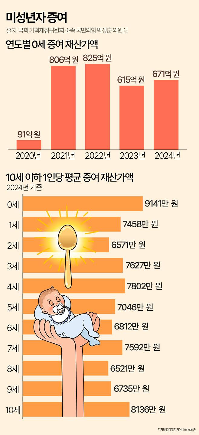 0세 증여 재산가액은 2020년 91억 원 수준이었지만 2021년 806억 원, 2022년 825억 원으로 급증했다. 2023년에는 615억 원으로 줄었다가 지난해에 다시 늘었다.