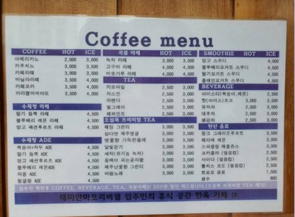 ‘카페 휴’는 매주 월요일부터 토요일 오전 10시 30분에서 오후 6시까지 운영하며 일요일은 문을 닫는다. 1인 1음료 주문에 최대 이용시간 2시간 제한이 있다. 아파트 입주민들에 한해 모든 메뉴를 500원 할인해주고 있다.