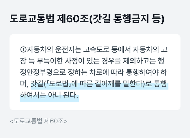 도로교통법 제60조에서 강조하듯 평상시 갓길은 꼭 비워둬야 되는데요. 갓길 주행 시엔 일반 승용차 기준 범칙금 6만 원에 벌점 30점이 부과됩니다. 면허 정지 기준이 40점이니 정말 큰 처벌이라 할 수 있겠네요!