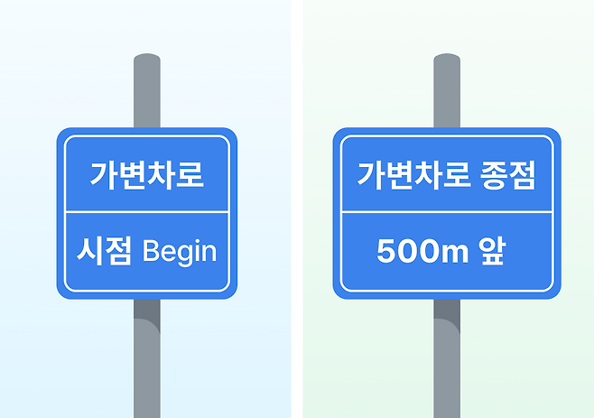 가변차로에선 신호뿐만 아니라 구간에 대한 이해도 중요한데요. 가변차로로 운영되는 구간은 제한되어 있으며 표지판을 통해 그 지점을 알리고 있습니다.