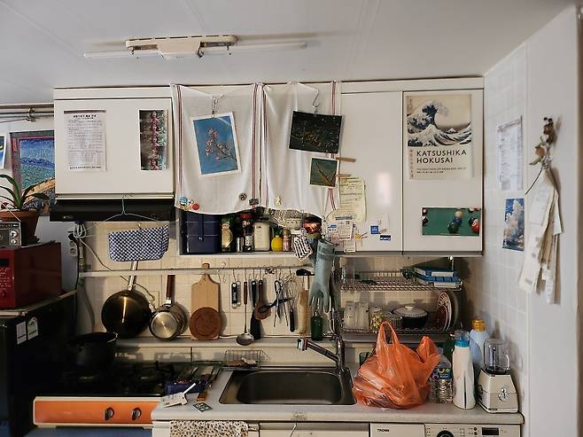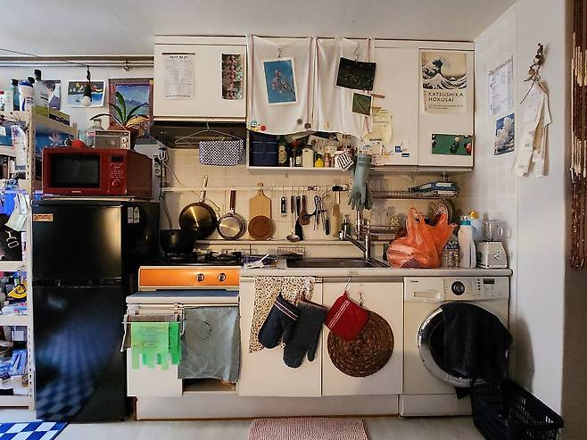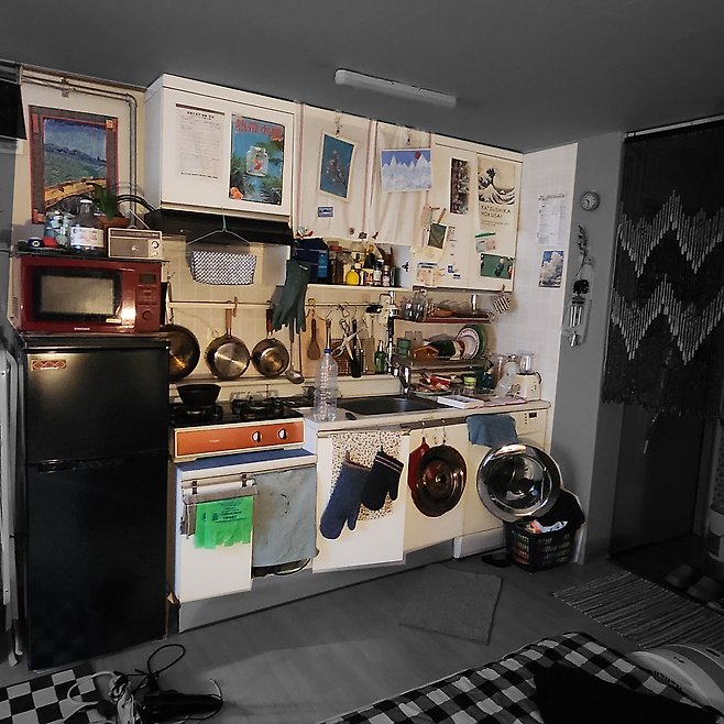 저희 집 주방은 흔한 원룸이나 자취방에서 늘 보이는 것처럼 흰색 수납장과 타일로 이루어져 있었습니다. 그런데 그게 전체적인 인테리어의 통일성을 깨고 다른 공간의 분위기와 맞지 않더라고요. 그래서 주방을 꾸밀 땐 이런 이질감을 어떻게 지우고 조화롭게 채울지를 가장 고민했습니다.