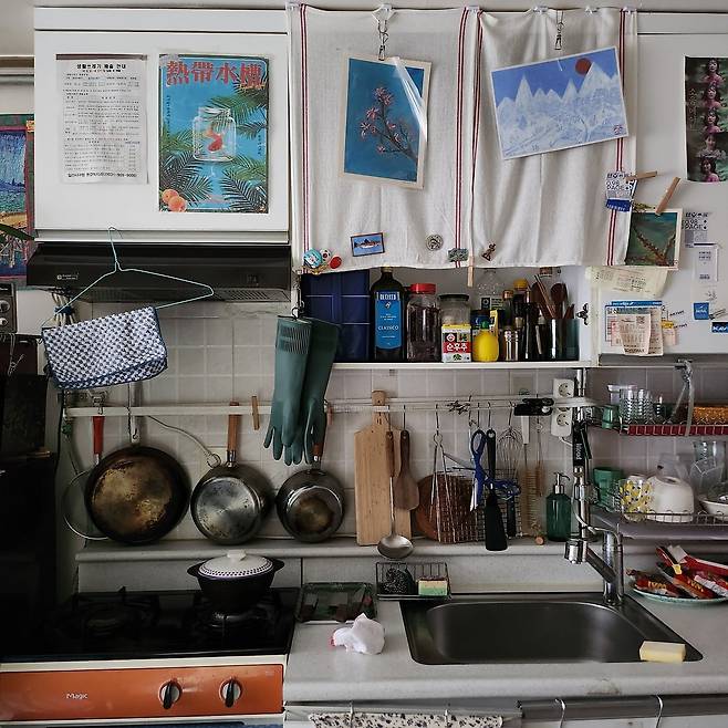 주방을 자세히 보시면 문 대신 행주가 달린 수납장이 보여요. 수납장이 나란히 이어져 갑갑해 보이는 것보다는, 중간에 패브릭으로 빈티지한 분위기를 주면 어떨까 하고 시도해 보았는데 정말 마음에 듭니다. 가장 좋은 점은 수납장 안의 알록달록한 소품이 눈에 잘 띈다는 거예요.