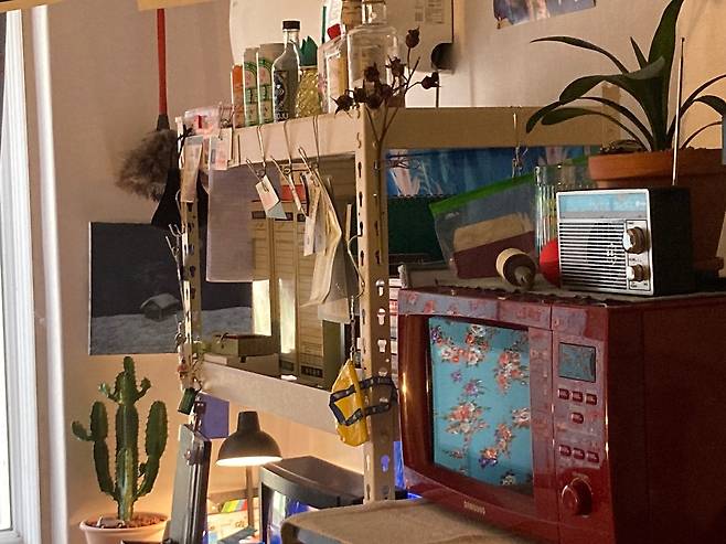 렉 선반과 책상은 지금까지 모아온 명함, 수집품, 여행에서 가져온 기념품, 책을 전시해둔 공간입니다. 다양한 물건 중에도 골동품 상점에서 구한 브라운관 TV를 개조해서 만든 어항은 눈에 잘 띄기도 하고, 개성 있는 포인트가 되어 애정하는 요소 중 하나입니다.