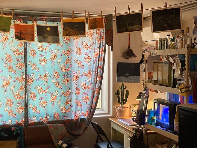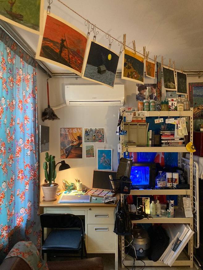 저희 집 천장에는 가스 배관이 드러나있었는데, 이 요소를 독특하게 살려보았습니다. 빨랫줄을 달아 지금까지 직접 그린 그림을 빨래처럼 달아둔 건데요. 이렇게 하니 가스 배관에 시선이 가지 않고, 오히려 작업실 같은 분위기가 나서 좋았습니다.