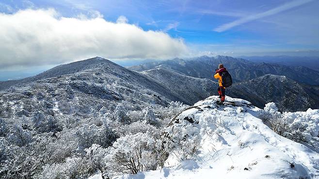 하얀 설원이 펼쳐지는 능선 위에서 잠시 숨을 고르고 바라보는 겨울 산의 고요함.