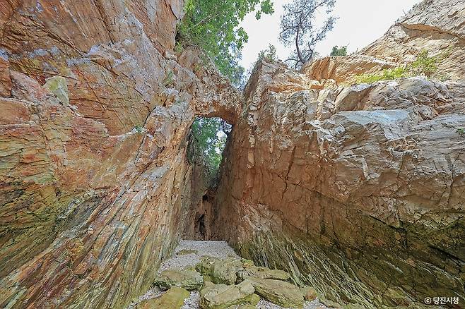 충남 당진시 석문면 장고항에는 아는 사람만 찾는 숨은 포토스팟이 있다. 일출 명소로 잘 알려진 노적봉 뒤편, 살짝 방향을 틀면 모습을 드러내는 '용천굴'이다. 겉으로 보기엔 평범한 해안 절벽 같지만, 안쪽으로 다가가는 순간 전혀 다른 풍경이 펼쳐진다.
