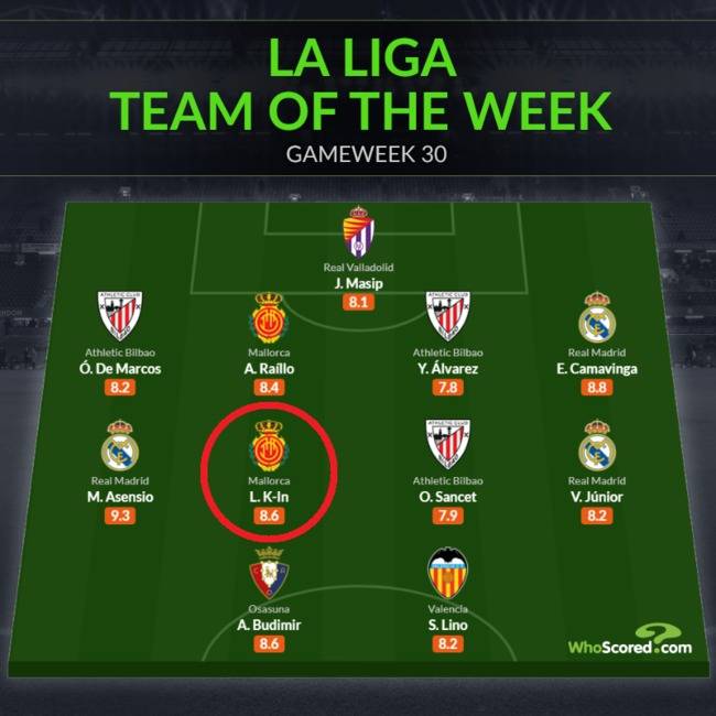 '후스코어드닷컴'은 2주 연속 스페인 라리가 베스트 일레븐에 이강인을 포함시켰다.