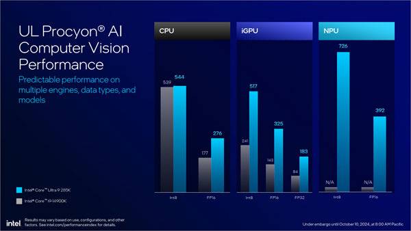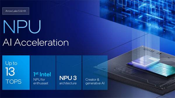 메테오 레이크에 통합된 NPU는 실리콘 면적 한계상 AI 엔진이 탑재된 그래픽 카드나 전용 가속기에 비해 절대 성능은 낮지만, CPU나 GPU의 AI 처리 부담을 경감해 보다 쾌적한 AI 경험을 가능케 해주며, 애로우 레이크에는 메테오 레이크에 쓰인 것과 동일한 성능의 NPU가 결합되었다.