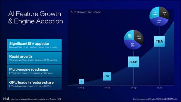 그러나 NPU가 통합된 AI PC의 출하량이 1억대에 달할 것으로 전망되는 2025년에는 AI 기능도 400개 이상에 달하고, 이들의 NPU 지원 비율도 지속적으로 높아져 보다 많은 사용자들이 쾌적하게 AI 기능을 활용할 수 있을 것으로 기대된다.
