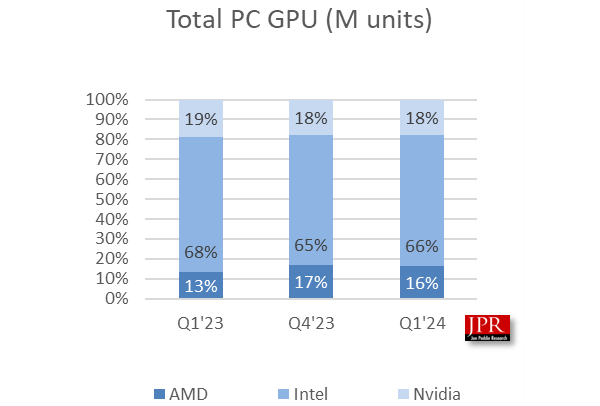보드나라 독자같이 최신 트랜드의 고성능 시스템을 추구하는 커뮤니티 참여자는 착각하기 쉽지만, 2024년 1분기 JPR 조사 결과에서 전체 PC GPU 중 인텔의 점유율이 과반을 훌쩍 넘은 것은 아직도 절대 다수의 PC에 내장 그래픽만 쓰이고 있다는 의미다.