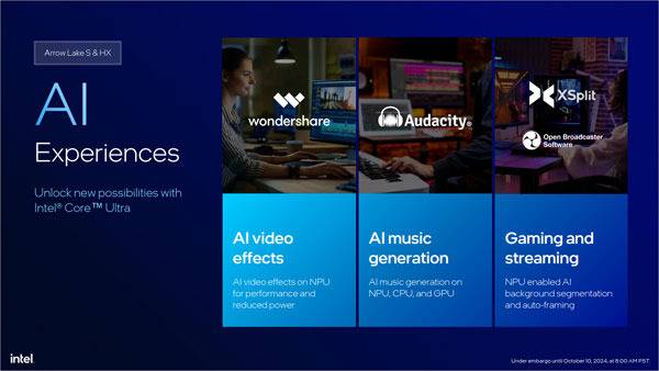 인터넷 방송 같이 실시간 컨텐츠 제공이 중요한 작업을 할 때는 방송 송출이나 컨텐츠 작업에 동원되는 CPU와 GPU에 부차적인 작업 부하를 줄여 주는 것이 중요한데, NPU는 이러한 웹 캠 관련 조정을 전담할 수 있으며, 음악 및 영상 작업에서도 일부 워크로드를 전담해 전체적인 성능을 끌어올릴 수 있다.