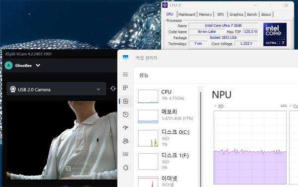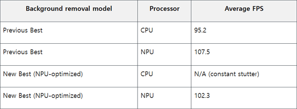 OBS와 함께 대표적인 방송 SW 중 하나로 손꼽히는 XSplit의 웹캠 제어 툴인 VCam은 NPU를 활용할 경우 정확도 40% 개선, 게임 스트리밍시 CPU를 활용한 VCam의 배경 제거 모델과 비교했을 때 NPU는 약 13%(이전 배경 제거 모델)와 7.5%(NPU 최적화 모델) 높은 성능을 제공, 이때 CPU에 비해 NPU의 소비전력이 최대 60% 가량 줄어든다는 내용을 발표했다.