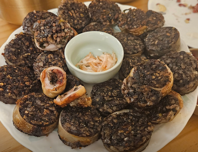 숯불막창순대: 숯불에 구워 겉은 바삭하고 속은 촉촉한 막창순대, 쌈장·소금·새우젓과 함께 즐기면 완벽한 조화