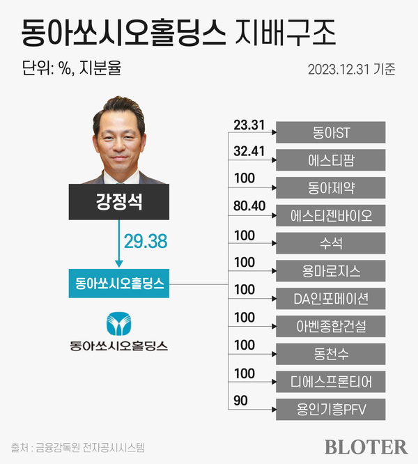 2023년 말 기준 동아쏘시오홀딩스의 최대주주는 강정석 회장이다. 지분 29.38%를 보유하고 있다. 동아쏘시오홀딩스는 동아에스티의 지분 23.31%, 동아제약 지분 100%를 보유하고 있다. 이외에도 △에스티팜(32.41%) △에스티젠바이오(80.40%) △수석(100%) △용마로지스(100%) △DA인포메이션(100%) △아벤종합건설(100%) △동천수(100%) 디에스프론티어(100%) △용인기흥PFV(90.00%) 등을 소유하고 있다.