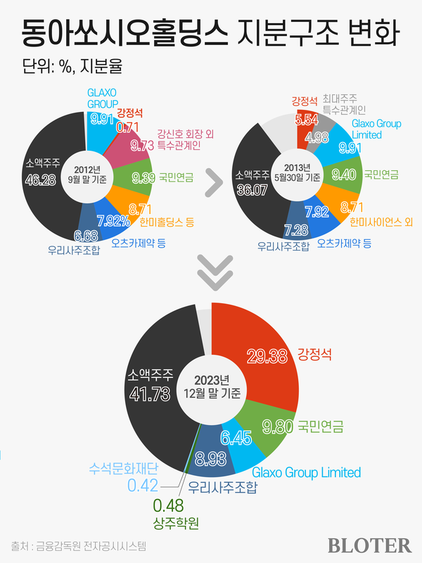 당시 강신호 회장은 동아쏘시오홀딩스의 지분 5.11%를 보유하고 있었다. 특수관계인 포함 10.44%를 보유하고 있어 최대주주였다. 강신호 회장의 특수관계인인 현 동아쏘시오홀딩스 회장 강정석 회장은 0.71%를 보유하고 있었다. 국민연금이 보유한 9.39%에도 턱없이 부족했다. 특히 한미사이언스가 보유한 8.71%에도 부족했다.