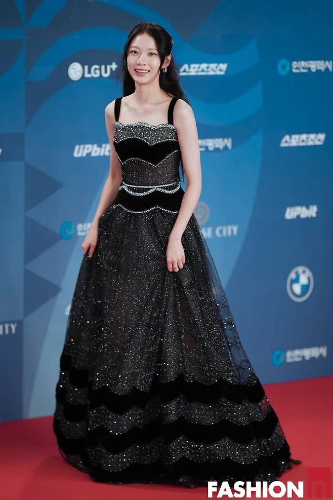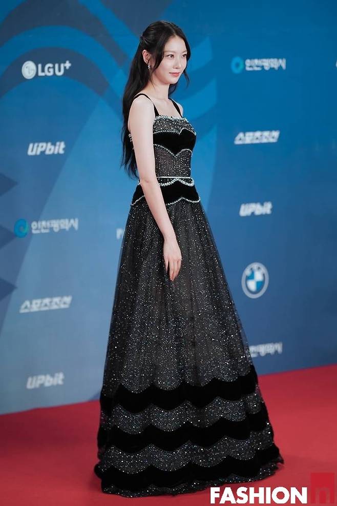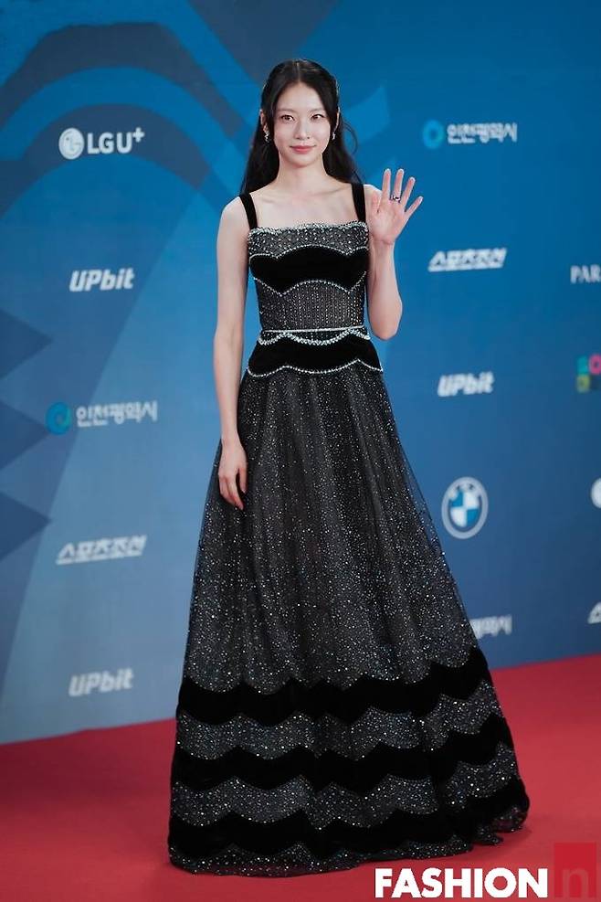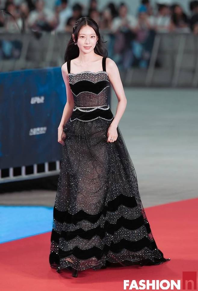 공승연은 드레스 밑단의 물결 프린트가 돋보이는 시스루 레드카펫 드레스룩 우아한 자태를 뽑냈다.