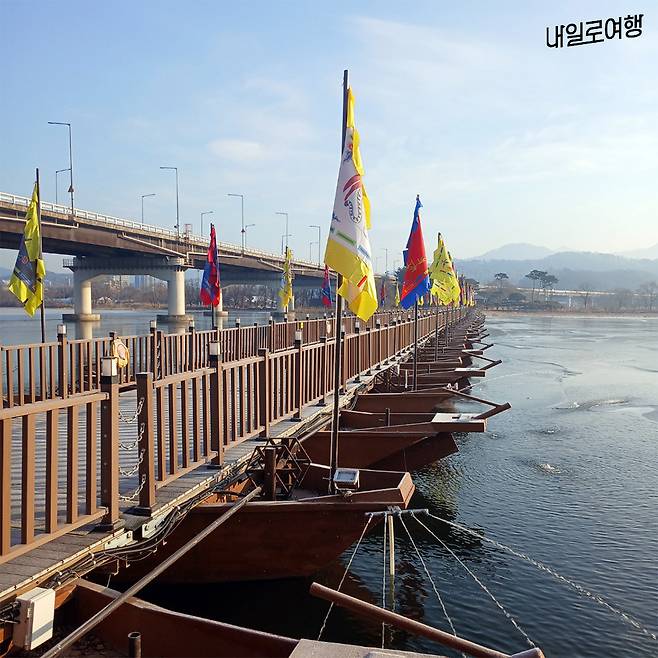 배다리 산책: 알록달록 깃발이 펄럭이는 전통 배다리 위에서 감성 충만한 산책을 즐겨보세요.
