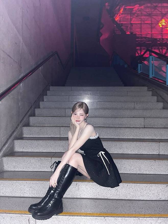 트리플에스 연지가 K-콘서트 무대 뒤 깨어난 듯한 포스 넘치는 착장으로 시선을 사로잡았다. 인스타그램 속 계단 위에 앉은 연지는 한 손으로 턱을 괸 채 몽환적인 표정으로 렌즈를 응시하며, 블랙 룩의 매력을 극대화했다.
