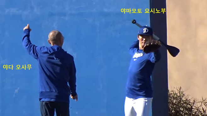 이때 야마모토가 캐치볼을 시작한다. 점점 거리를 늘려간다. 그러더니 오른쪽 펜스 앞에서 홈까지 뿌린다. 우리식 현장 용어로 롱토스, 혹은 원투(遠投)라고 부르는 세션이다.