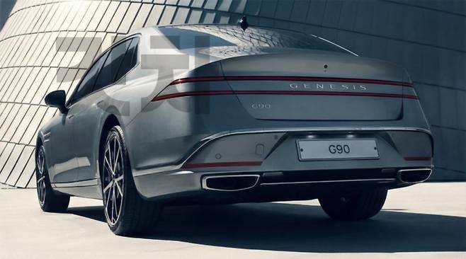 렌더링 속 G90의 후면은 기존 분리형 바 디자인에서 벗어나, 얇은 2줄 테일램프가 차체 전체를 수평으로 가로지르는 형태를 띤다. 이 같은 디자인은 ‘제네시스 X 그란 쿠페’와 GV90의 디자인 방향을 예고한 ‘네오룬 콘셉트’에서 영감을 받은 것으로 분석된다. 미니멀한 조형미를 강조한 하부 페시아와 배기구를 감춘 새로운 범퍼 디자인 역시 최신 제네시스 디자인 언어인 ‘애슬레틱 엘레강스’의 진화를 보여준다.