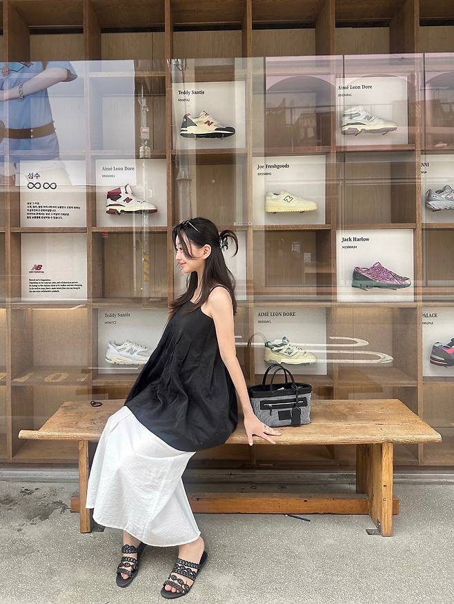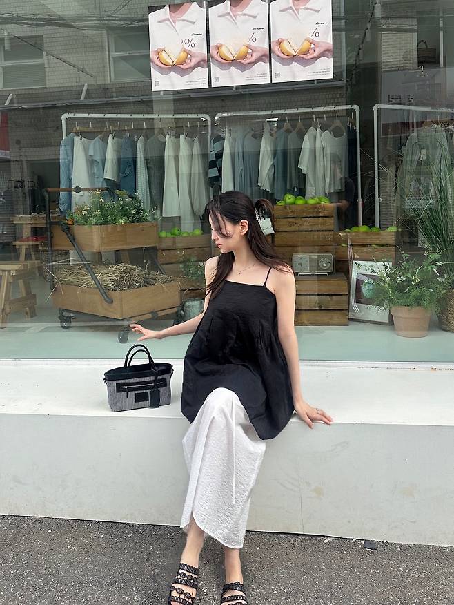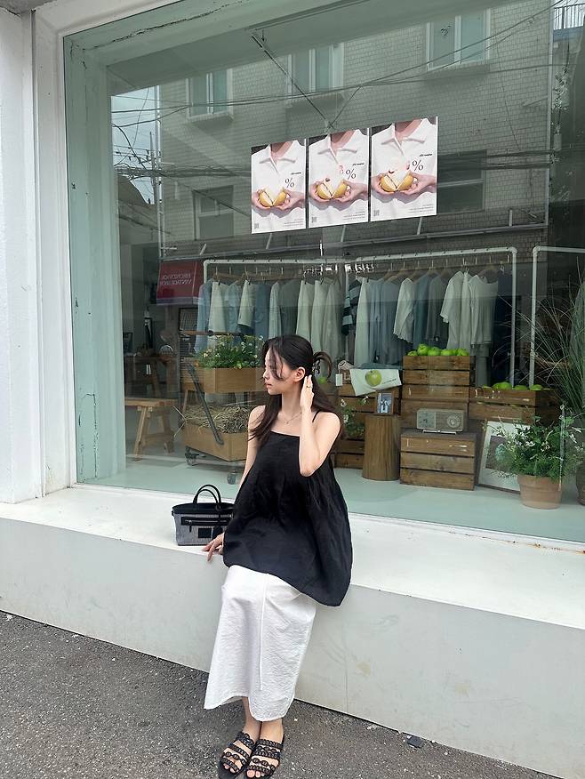 블랙 민소매 톱은 루즈한 볼륨감이 자연스럽게 실루엣을 잡아주고, 새하얀 롱스커트는 그 위에 맑게 드리워졌어요.