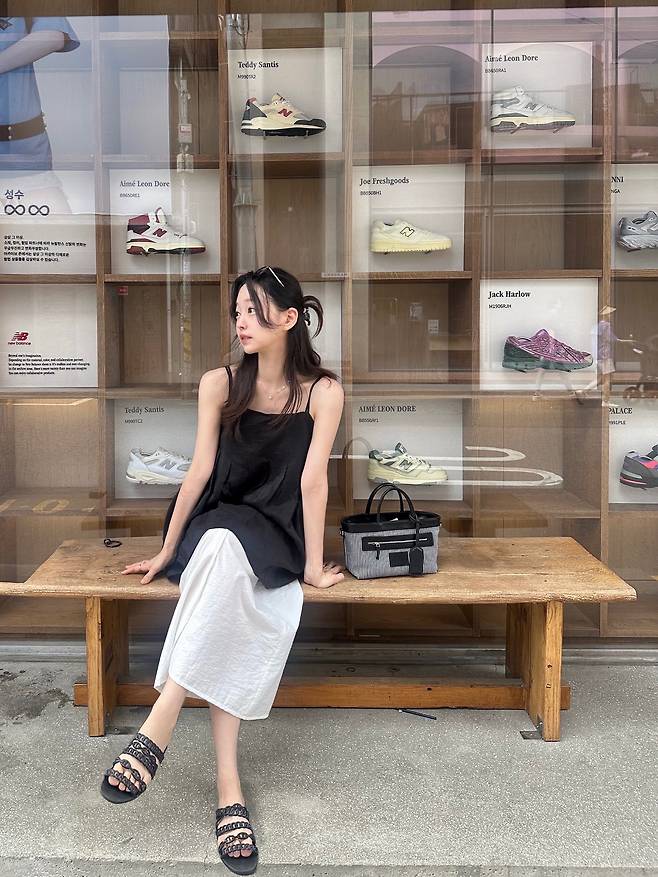 샌들과 미니 백 역시 스타일의 균형을 해치지 않는 선에서 힘을 더해줬고요.