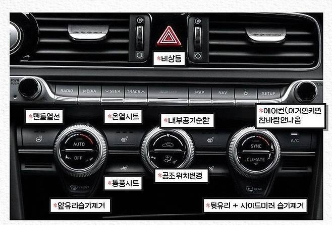 센터페시아(Center Fascia): 내비게이션, 오디오, 공조기 조작부