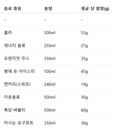 스포츠·이온음료 – 운동 후 수분 보충을 위해 마시지만, 실제로는 당분이 10g 이상 들어 있는 경우가 많다.