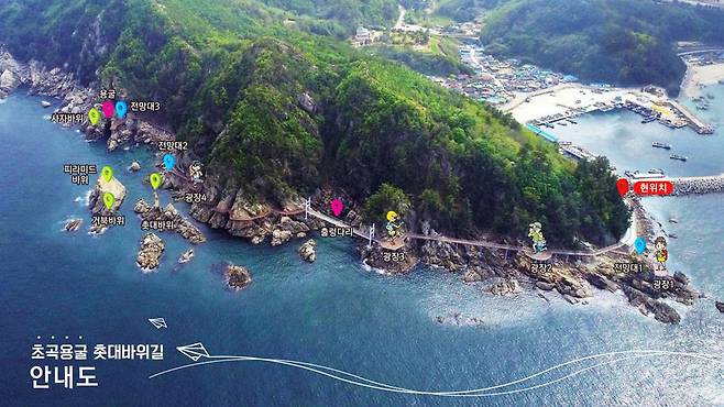 탐방로의 시작점에는 구렁이가 용으로 승천했다는 전설이 전해지는 용굴이 자리한다. 굴 앞에는 작은 어선이 드나들 정도로 고요한 바다가 펼쳐지고, 그 주변에는 해풍에 깎인 기암괴석이 장엄하게 늘어서 있다.