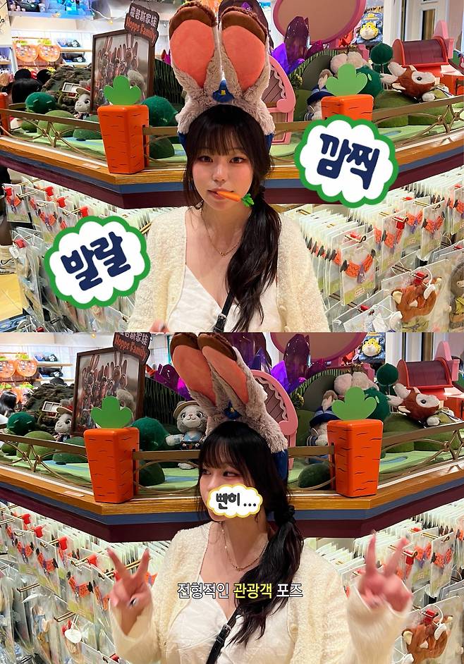 알록달록한 디즈니랜드 배경 속에서도 튀지 않으면서 조화롭게 스며드는 컬러 매치였어요.