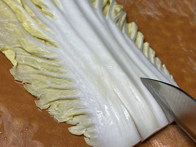 배추의 줄기 쪽은 단단한 편이기 때문에 부치기 전에 살짝 손질합니다. 전으로 부칠 때는 줄기 부분에 칼집을 살짝 내 주면 익는 속도가 고르게 맞춰지고 식감도 한결 부드러워집니다.