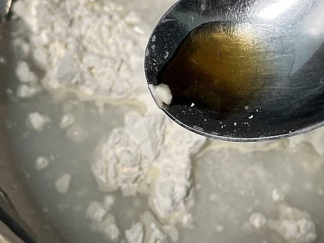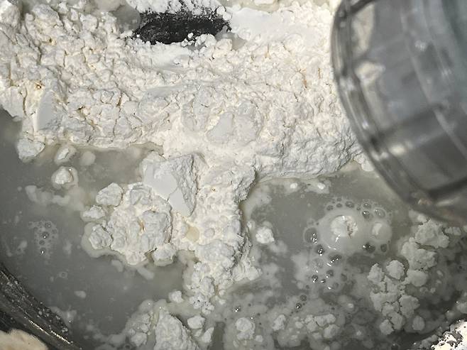 밀가루와 물을 1:1 비율로 넣은 다음 잘 섞어서 반죽을 만듭니다. 반죽의 점도는 너무 되직하지 않고 떨어뜨렸을 때 살짝 흐르는 정도가 되는 좋습니다.
