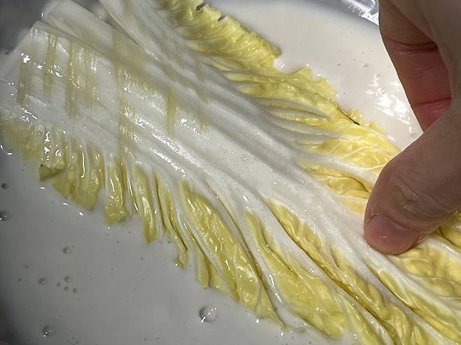 배춧잎은 한 장씩 분리한 다음 깨끗한 물이 1~2회 헹궈 주세요. 그다음 채반에 밭쳐 놓거나 키친타월을 활용해 물기를 최대한 제거합니다.