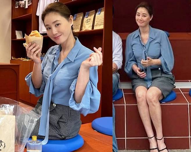 김성령은 하늘빛 리본 블라우스에 하운드투스 체크 반바지를 매치해 차분하면서도 생기 있는 톤온톤 코디로 시선을 사로잡았습니다.