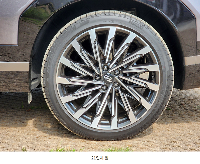 휠은 무려 21인치 휠이 들어가는데 사이즈는 245/45R21로 편평비가 상당히 낮은 타이어가 들어갑니다. 주행소감에서 다시 언급하겠지만 편평비가 낮고 너무 큰 휠이 들어가게 되면서 승차감 측면에서 손해보는 것이 있지 않나 싶습니다.