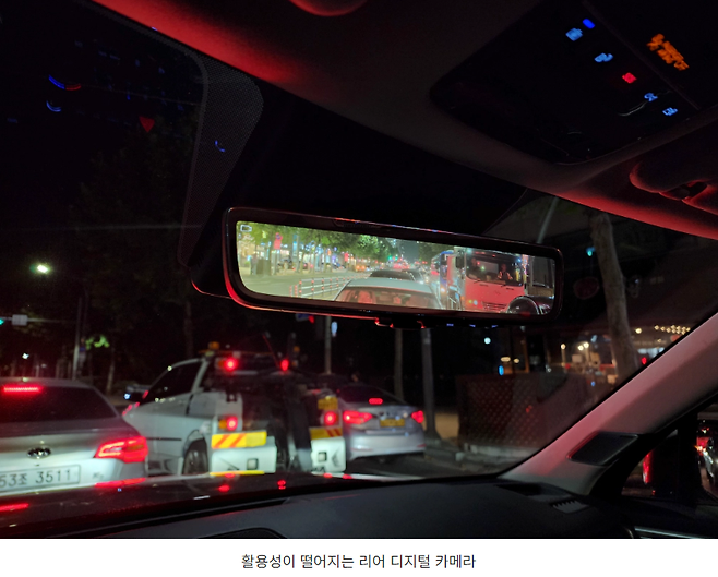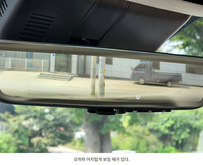 낮시간에 사용했을 때는 더 큰 문제입니다. 카메라 화면과 빛이 반사가 된 모습이 동시에 투영이 되는데 이 둘의 화각이 전혀 다르기 때문에 시선이 완전히 꼬여버립니다. 따라서 상당히 어지럽기도 하고 오히려 헷갈리기 때문에 저는 주행하는 내내 사용하질 않았습니다. 비가 오는 날에는 좀 쓸만하지 않을까 기대를 하다가도 그냥 안쓰게 될 것 같습니다. 이 옵션은 전혀 욕심을 낼 필요는 없다. 이렇게 말씀드리겠습니다.