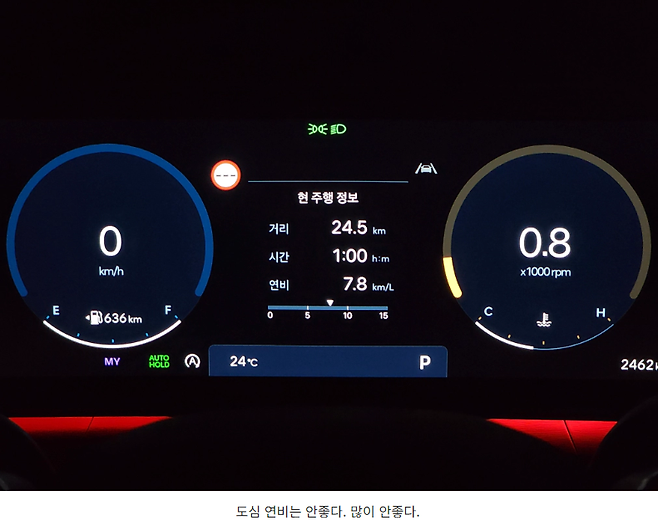 하지만 도심 주행에 걸맞지 않는다는 가장 큰 이유는 역시나 연비입니다. 고배기량, 고출력 엔진이고 크고 무거운 차량이니 연비가 좋을수가 없습니다. 오토스탑이 열심히 작동을 해도 시동OFF 상태를 길게 유지하지 못하고 아무리 탄력 주행과 오토스탑에 의존을 해도 연비는 낮습니다. 순간 연비를 보여주는 인디케이터에도 겨우 15까지 표시해둔 건 다 이유가 있는 겁니다.