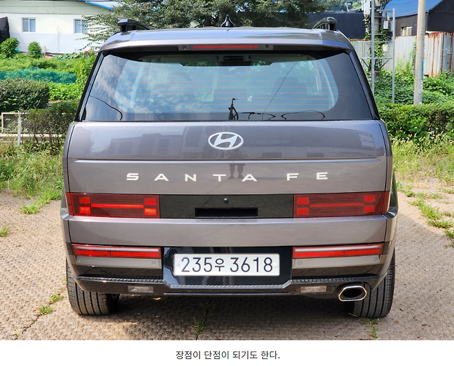또한 어색함을 만들어 내는 이유 중 하나는 바로 리어 해치의 크기와 면적입니다. 스타리아가 연상될 정도로 상당히 입구가 큰데 이는 여러가지 장단점으로 이어집니다. 가장 큰 장점은 역시나 큰 짐을 수납할 수 있다는 겁니다. 대부분의 차량은 실내의 적재공간보다 입구가 작기 때문에(≠레이 제외) 공간이 있어도 넣지를 못하는 경우가 잦은데 적어도 싼타페는 예외입니다.