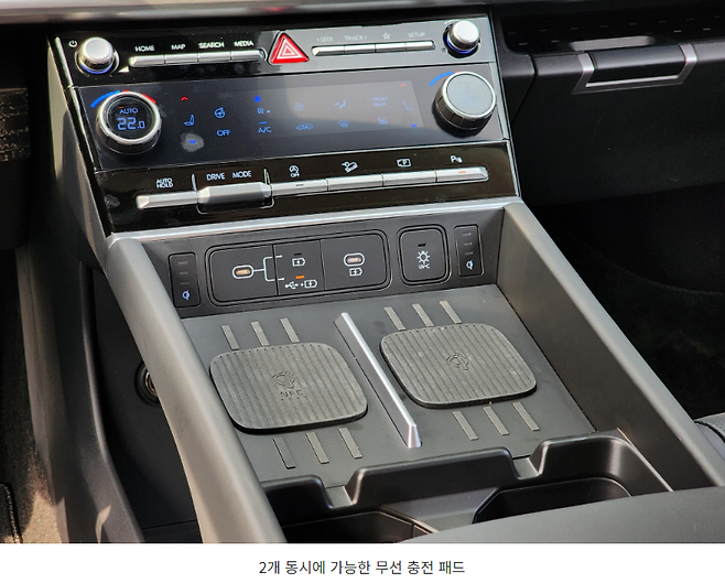 현대차 최초로 무선 충전 패드를 2개 배치했는데 사용해보니 그다지 만족스럽지는 않았습니다. 차량의 상하좌우 움직임이 좀 큰 편이라 그런지 충전 패드에 폰을 올려두면 움직이면서 충전이 되지 않거나 아주 느리게 되는 경우들이 잦아 결국 유선을 꺼내게 되더군요.