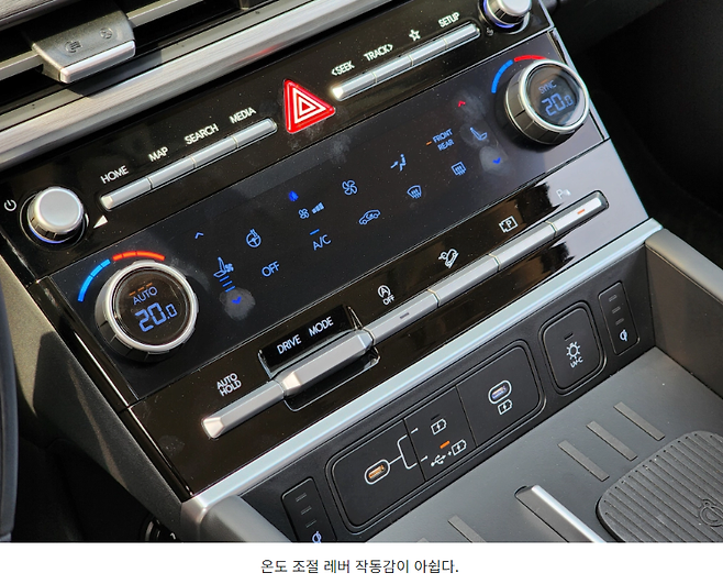 공조기 패널은 이전 모델 대비 버튼의 수를 상당히 줄이면서 정리를 잘했는데 단점이 있습니다. 일단 온도 조절을 위해 다이얼을 돌렸을 때 절도감이 부족하고 유격도 많아 작동감이 나빴습니다.