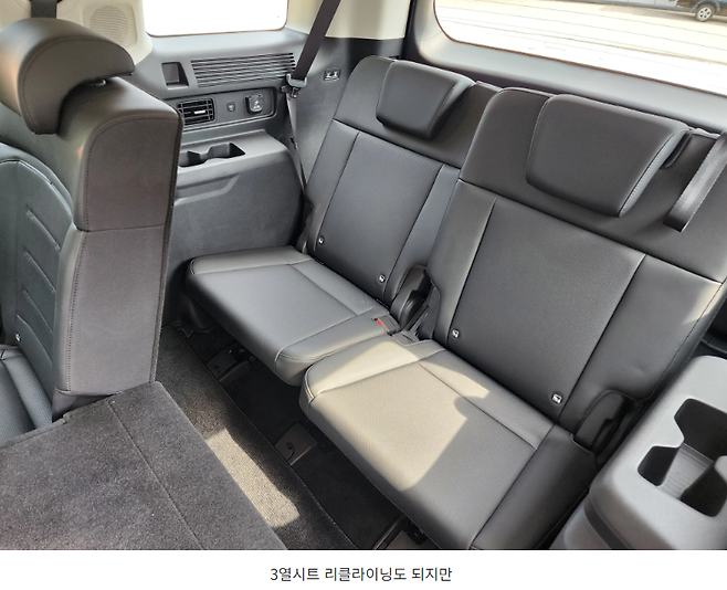 또한 3열 시트도 리클라이닝이 가능하고 2열 시트의 앞뒤 슬라이딩 거리의 자유도(약 30cm)가 상당하기 때문에 2/3열 승객이 조금씩만 배려하면 상당한 레그룸이 나오게 됩니다.