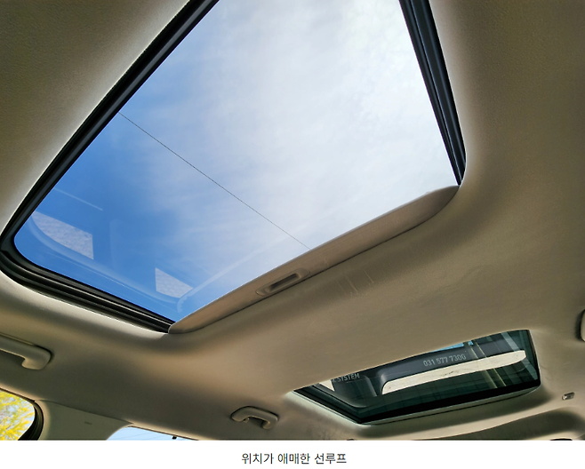 앞뒤로 듀얼 선루프가 들어가게 됩니다. 크기도 좋고 3열에 탑승했을 때 이 선루프 덕분에 개방감이 더 좋긴 한데 위치가 좀 애매합니다. 앞쪽 선루프는 1열 탑승객에게 잘 보이지 않고 뒤쪽 선루프는 2열 탑승객에겐 좀 뒤에 있는 느낌입니다. 설명하자면 1/2/3열 시트가 있다면 선루프를 1.5/2.5열에 있는 느낌입니다. 뒤쪽 선루프는 선바이저 외에 개방은 되지 않기 때문에 평소 선루프는 좋아하는 편이지만 그다지 추천드리고 싶을 정도는 아니더군요.