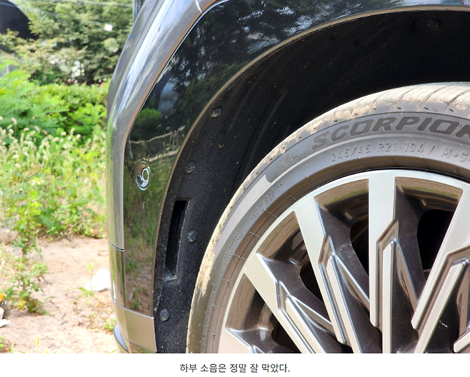 하지만 최신 현대차가 그러듯 방음/방진에 상당히 신경을 쓴 모습입니다. 후드를 열었을 때 보이는 휠하우스 외부에도 방음 패드가 부착되어 있고 앞뒤 휠 하우스를 감싸고 있는 휠가드도 상당히 잘 만들어져 있습니다. 덕분에 하부 소음을 상당히 억제하는 편입니다