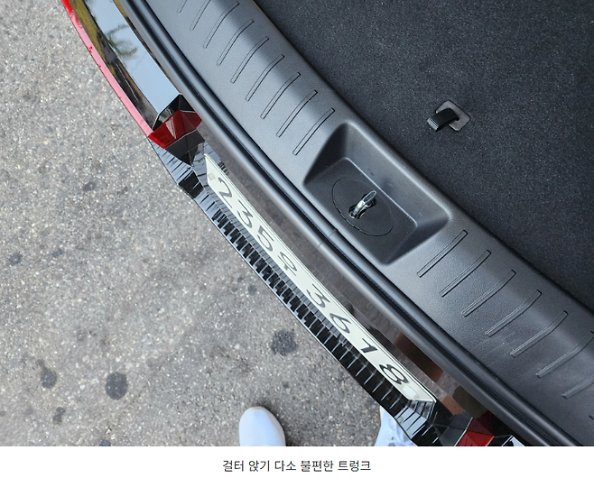 차량 후면이 멀리서 봤을 때는 매끈하게 수직으로 떨어질 것 같았지만 막상 걸터 앉으려니 범퍼 끝단이 돌출되어 있더군요. 앉을 수는 있지만 해치백 차량들은 주행하면서 후면이 빠르게 오염되기 때문에 이곳에 옷이 닿게 되면 옷이 더러워질게 분명해 보입니다.