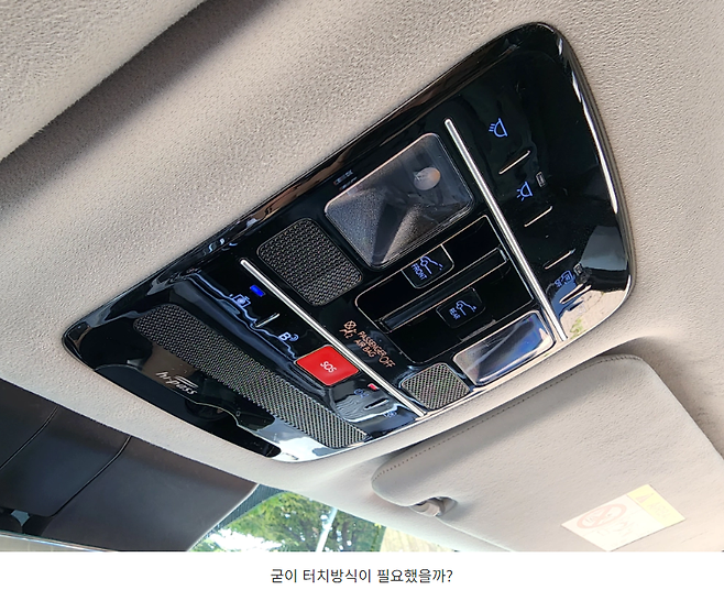 조명, 선루프 등과 관련된 1열 헤드라이닝의 패널이 있는데 조명과 블루링크 버튼 등이 모두 터치 방식입니다. 개인적으로는 굳이 이곳에 터치 방식을 넣을 필요가 있었을까 싶습니다. 운전을 하는 도중에도 사용하게 되는 버튼들이다보니 터치 방식보다는 그냥 물리식 버튼으로 구성하는게 좋지 않았을까 싶네요.