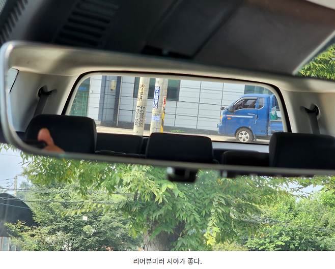 또다른 장점은 리어 해치 글라스의 좌우/위아래 면적이 상당하기 때문에 리어 뷰 미러(=룸미러)로 보이는 후방 시야가 상당히 좋다는 겁니다. 가끔 리어뷰 미러가 답답한 차량들을 타보면 운전할 때 영 불편한데 이 차는 전체적으로 스타리아와 같이 차량 전체의 유리 면적이 커서 개방감도 좋고 운전하기도 편합니다.