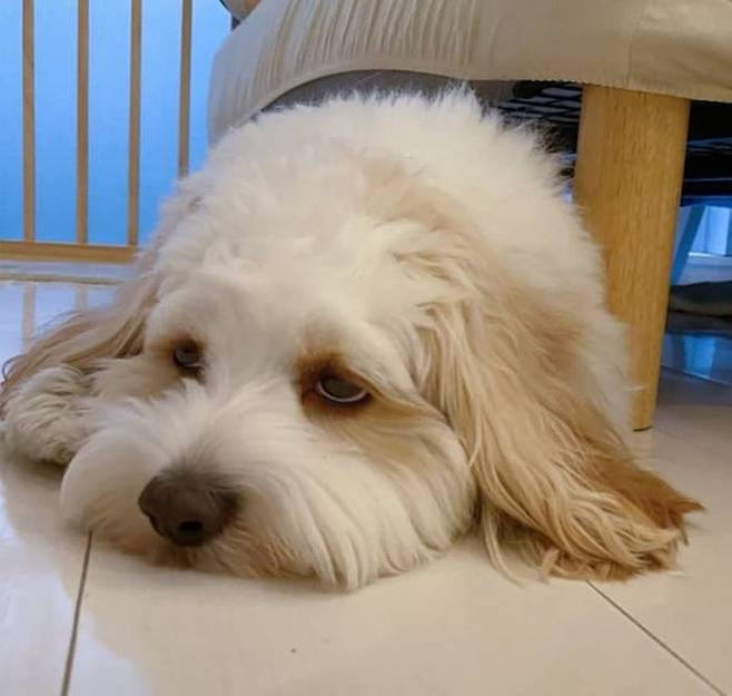 강아지 힌과 독같은 표정으로 바닥에 엎드려 있는 이 강아지는 쿠바 국견으로 알려진 하바니즈(Havanese) 견종이라고 합니다.