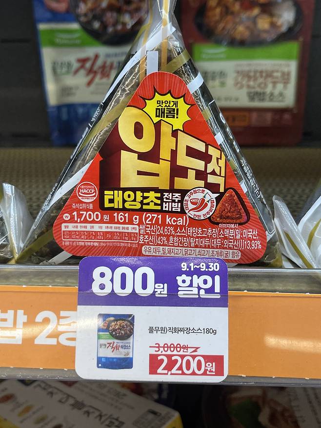 압도적 태양초 전주비빔 삼각김밥’은 기존 전주비빔에 태양초 고추장으로 만든 매콤한 비빔 소스를 더하고, 고기 함량을 늘린 큼지막한 삼각김밥이에요.